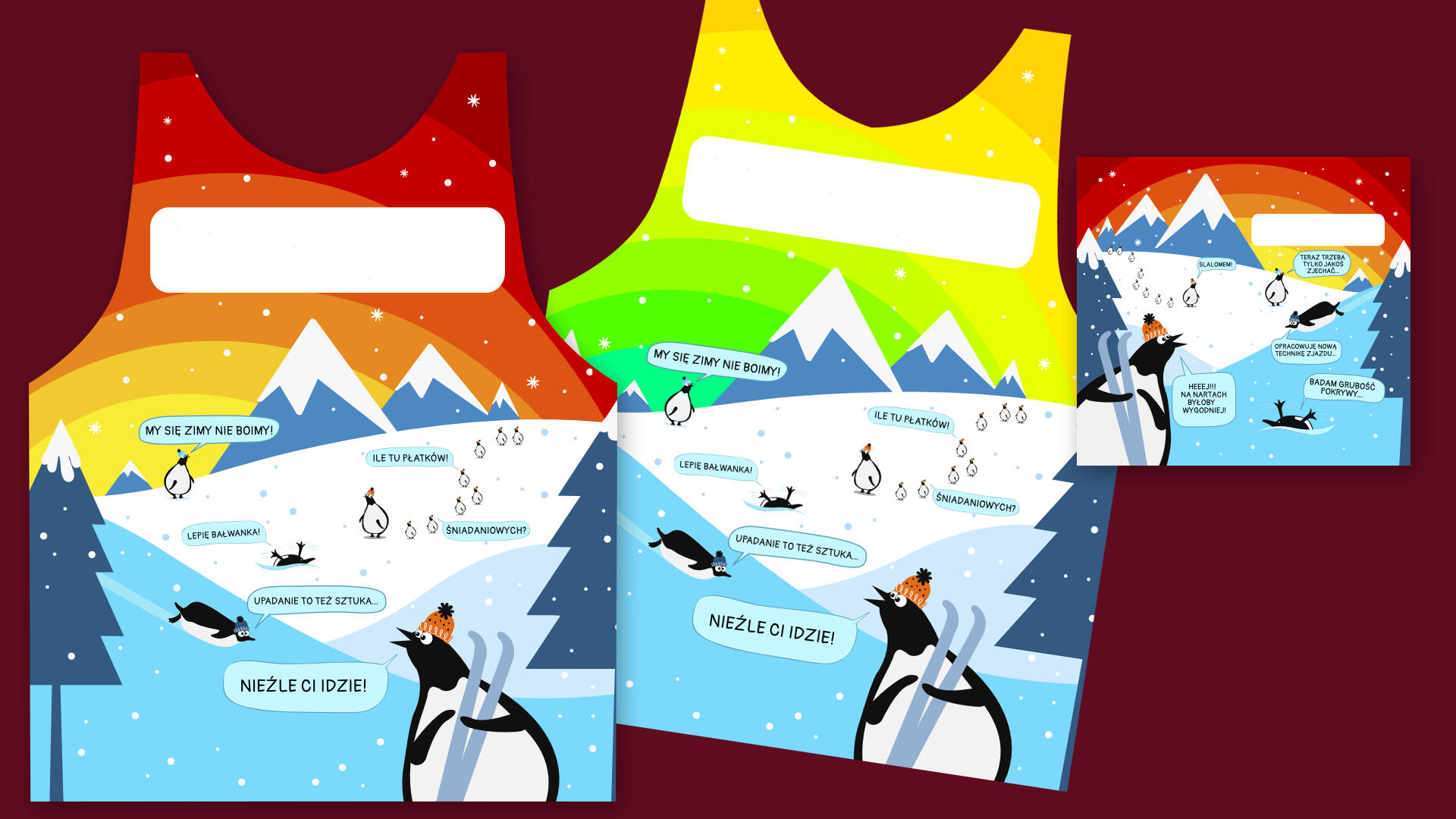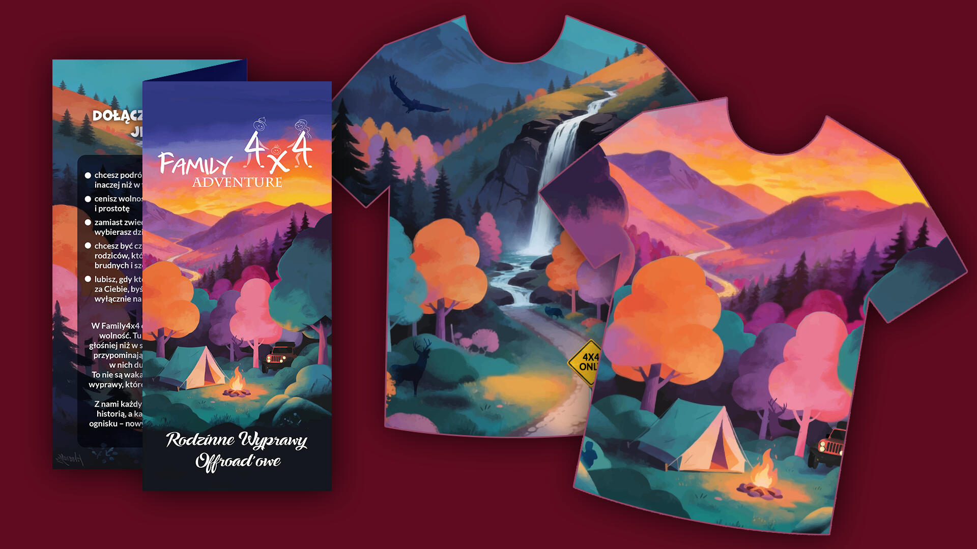 Przykład: Projekt grafiki głównej + adaptacja na koszulkę, komin i torbę, przygotowanie plików do druku.